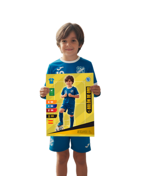 Un cromo gigante personalizado, donde puedes elegir el modelo de balón de oro o cualquier otra tarjeta de fútbol de la temporada 2025-2026. Además, podrás acompañarlo con las cartas mini, que son cromos muy chulos para regalar a amigos.