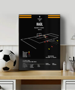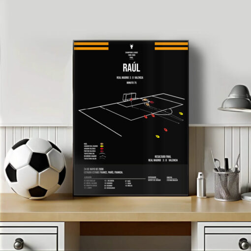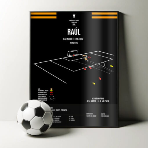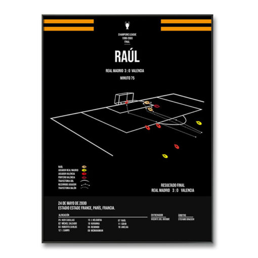 Revive con este póster el emblemático gol de Raúl González Blanco en la final de la Champions League 1999-2000 contra el Valencia. En una veloz carrera desde el mediocampo, Raúl culminó con una definición precisa para sellar el 3-0, dando al Real Madrid su octava Copa de Europa y consolidando su leyenda en el club.